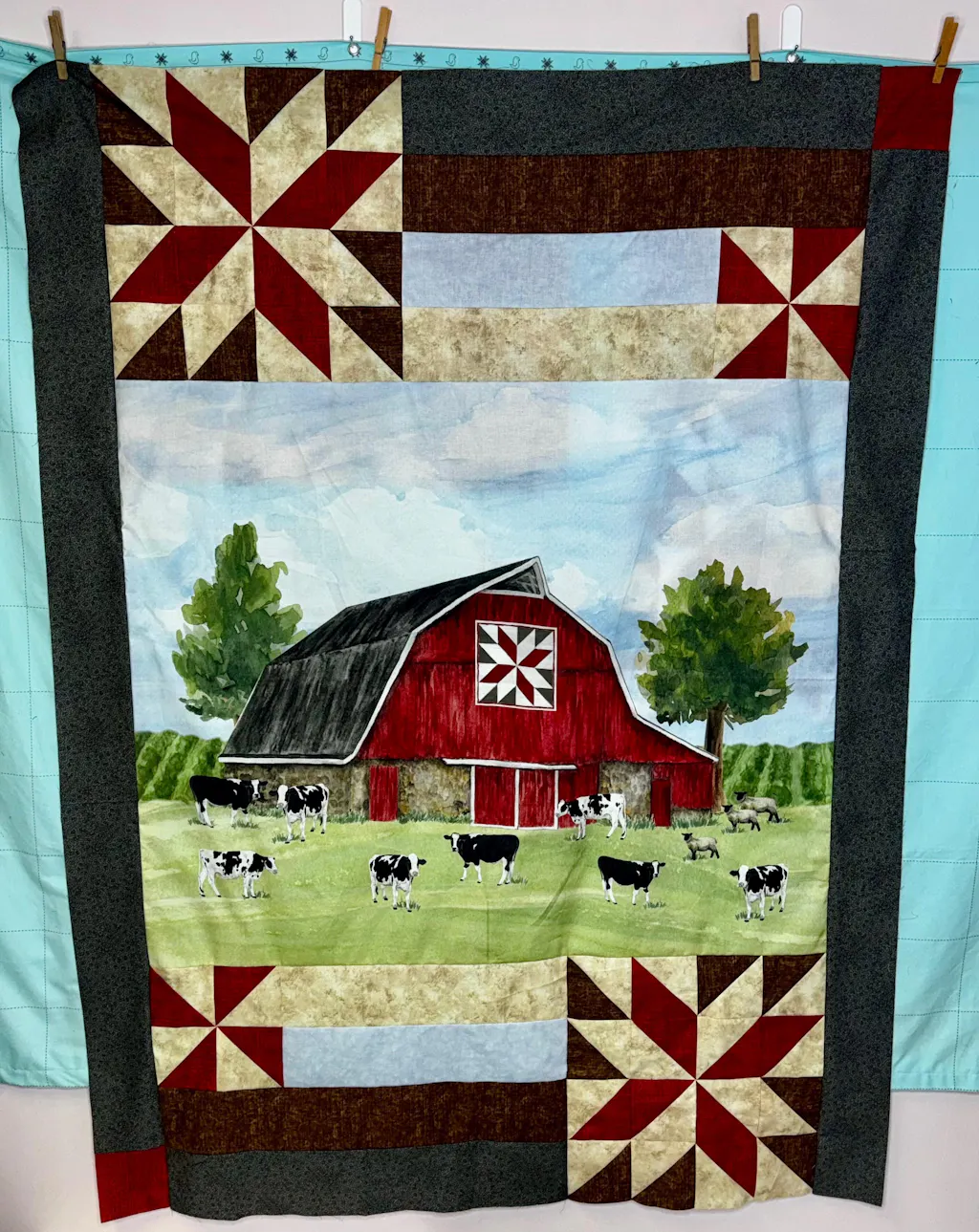 This classic country style quilt features a charming red barn and holstein cows gathered around in watercolor style art. The border perfectly frames and compliments the colors in the quilt as well as the wood barn quilt featured in the artwork. Create this little masterpiece so fast with a beginner friendly pattern and you'll have a great lap sized quilt done in no time.